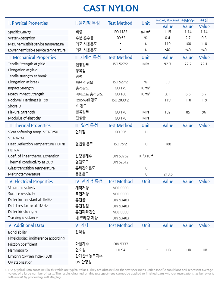 카프로락탐의 음이온 중합에 의해 생산되는 캐스트 나일론은 광범위한 용도로 사용되어집니다. 그리고 사출 또는 압출 PA 6 에 비해 향상된 기계적 열적 내화학적 물성을 갖습니다. 착색제, MoS2, 오일, 윤활제 그리고 대전방지제등의 첨가에 따라 그 물성이 강화될 수 있습니다.