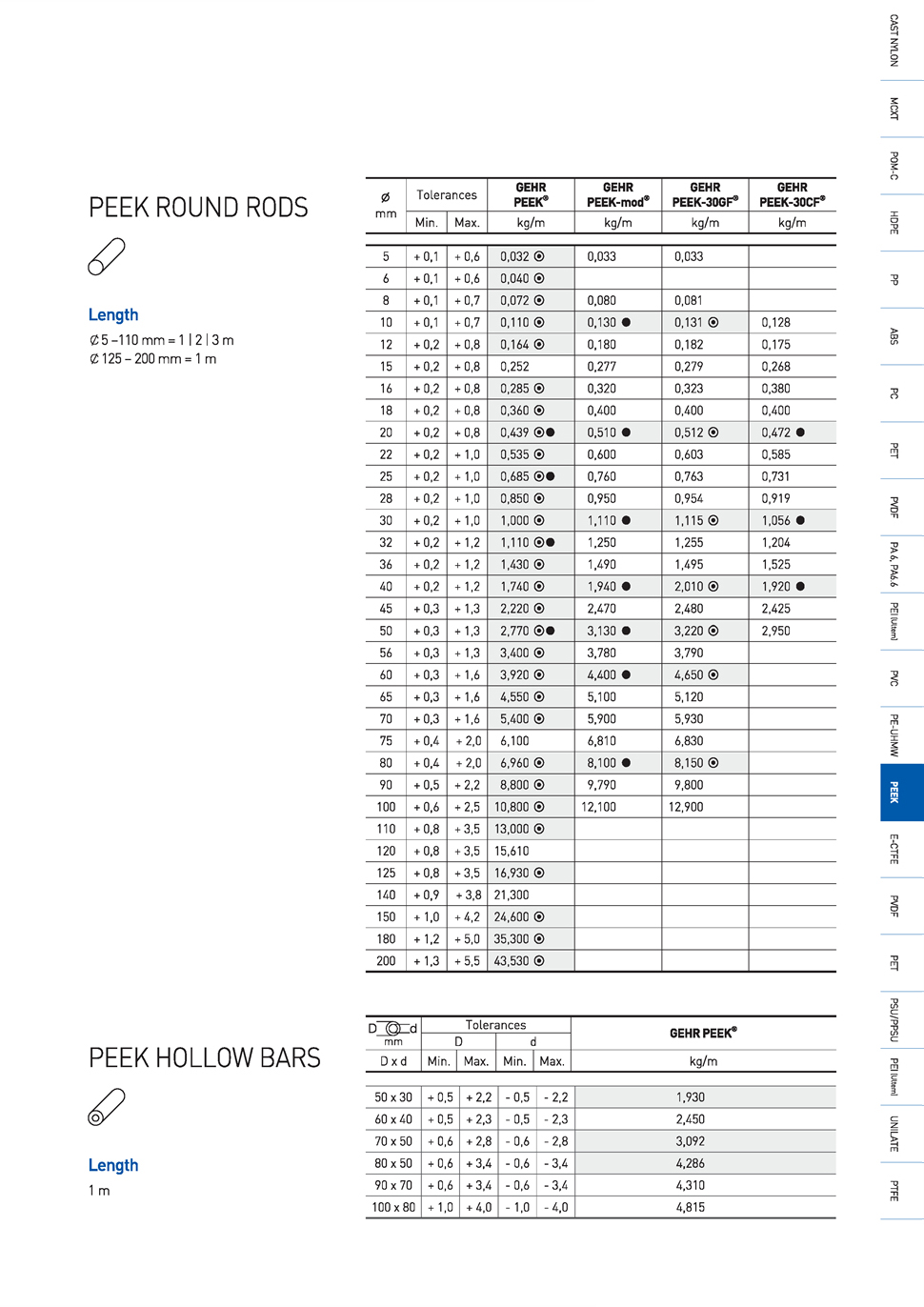PEEK는 Poly Etheketron 수지를 압출성형한 열가소성 고기능 플라스틱으로, PSS(PolyPhenylen Sulfide)와 유사한 내약품성, 내수분성을 가지고 있지만 PPS(220℃/426° F)보다 높은 연속사용온도(250℃/480° F)를 가지고 있다.